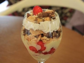 1. Em uma vasilha coloque um pouco do creme, depois coloque as bolachas molhadas em um pouco de leite, assim intercalando com os morangos e sonhos de valsa
